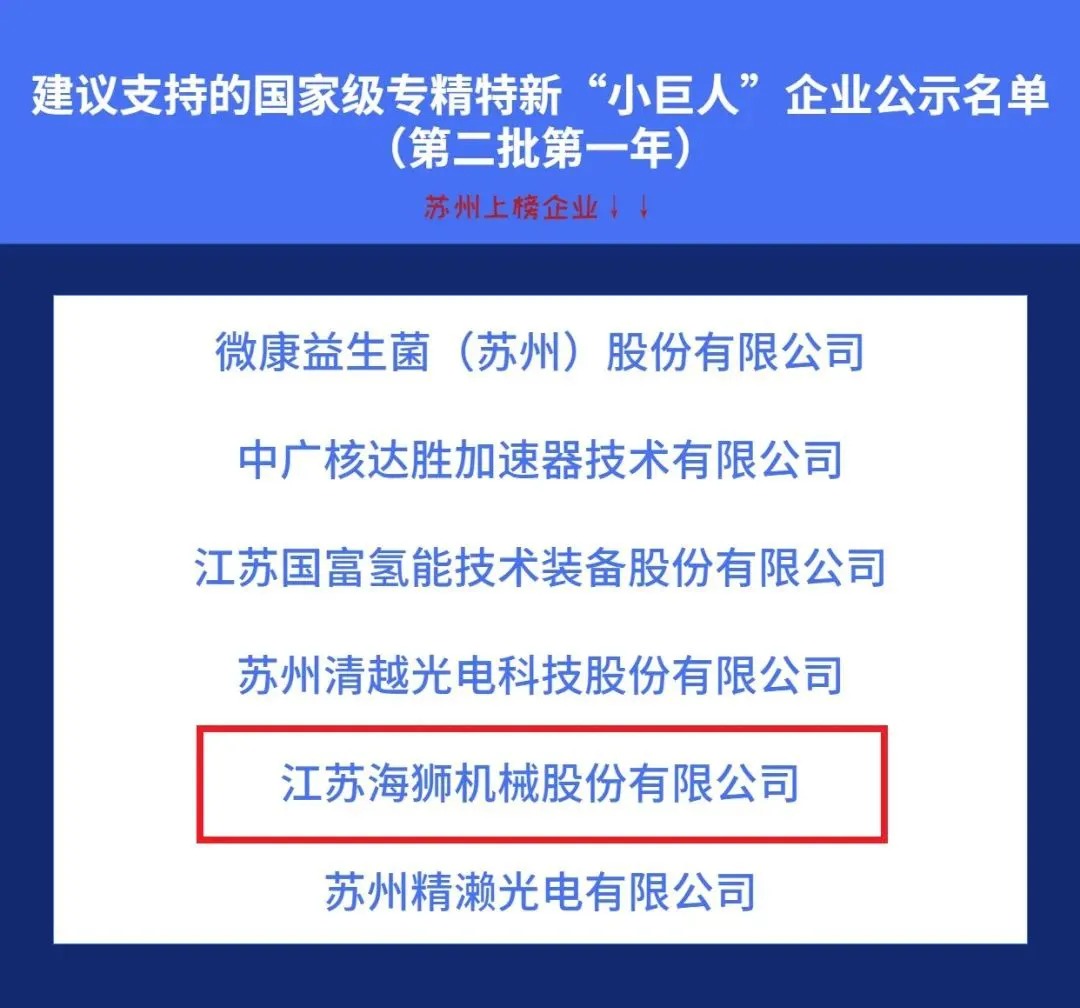 近日,工信部公示了建議支持的第二批第一年國家級(jí)專精特新“小巨人”企業(yè)名單中,江蘇海獅機(jī)械股份有限公司榜上有名!