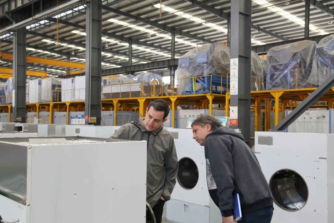 近日,海外客戶蒞臨海獅機械總部,近距離參觀了海獅洗衣龍系統、工業水洗機、烘干機、高速熨燙線等核心產品的整個生產裝配過程。