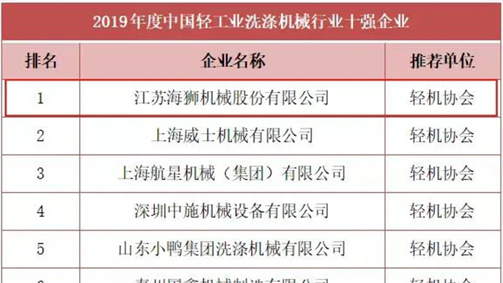 近日,中國輕工業聯合會揭曉了2019年度中國輕工業百強、輕工業裝備制造五十強、行業十強榜單,海獅機械榮登雙榜單。五十強年度中國輕工業裝備制造行業五十強榜單由中國輕工機械協會推薦的有22家企業榮登2019年度中國輕工業裝備制造行業五十強榜單,海獅機械排名第13位。行業十強年度中國洗滌機械行業十強榜單由中國輕工機械